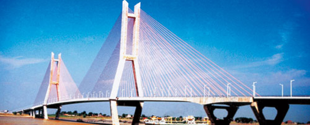 湖北鄖陽漢江大橋 全長586米,主跨414米,索塔高108.5米,地緢式PC砼斜拉橋,1994年6月建成通車。主跨居同期同類橋梁亞洲第一,世界第二。