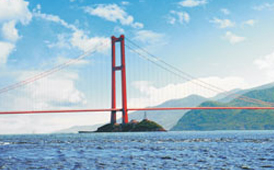 重慶萬(wàn)州長(zhǎng)江二橋 全長(zhǎng)1148.86米,主跨580米,鋼桁梁懸索橋,2003年6月建成通車。獲2008年國(guó)家優(yōu)質(zhì) 工程銀獎(jiǎng)。