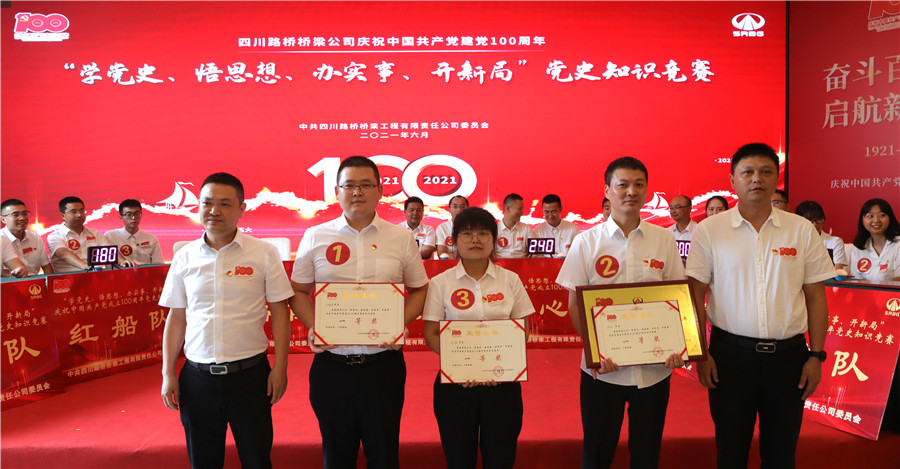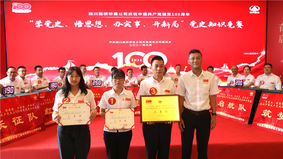讓黨史學(xué)習(xí)“火”起來(lái), 營(yíng)造“比學(xué)趕超”良好氛圍。本次知識(shí)競(jìng)賽已籌備一月有余,經(jīng)過(guò)六月初7000余人名職工和產(chǎn)業(yè)工人自發(fā)參與網(wǎng)絡(luò)初賽答題,到6月17日42家單位395名黨員、預(yù)備黨員及積極分子共同參與線上集中復(fù)賽答題,公司高質(zhì)量高標(biāo)準(zhǔn)把關(guān),甄選出22名黨建精英進(jìn)入總決賽,此次競(jìng)賽涵蓋了中國(guó)共產(chǎn)黨建黨百年來(lái)的革命史、新中國(guó)史、改革開(kāi)放史、社會(huì)主義發(fā)展史等選題內(nèi)容,共設(shè)五個(gè)環(huán)節(jié),分為個(gè)人必答題、小組必答題、搶答題、風(fēng)險(xiǎn)題、附加題。隨著比賽向前推進(jìn),現(xiàn)場(chǎng)競(jìng)賽“火藥味”逐漸濃烈,臺(tái)上選手自信滿(mǎn)滿(mǎn)胸有成竹,臺(tái)下觀眾津津有味全程互動(dòng),長(zhǎng)征隊(duì)、紅船隊(duì)、天路隊(duì)、星火隊(duì)、初心隊(duì)、啟航隊(duì)、筑夢(mèng)隊(duì)七個(gè)隊(duì)伍你追我趕,還有“幸運(yùn)22”號(hào)實(shí)力加持、推波助瀾,將活動(dòng)氛圍推向高潮。經(jīng)過(guò)激烈角逐,天路隊(duì)、初心隊(duì)和“幸運(yùn)22”、筑夢(mèng)隊(duì)分別榮獲黨史知識(shí)競(jìng)賽決賽的第一名、第二名、第三名,公司領(lǐng)導(dǎo)親自為獲獎(jiǎng)隊(duì)伍頒發(fā)獎(jiǎng)牌和榮譽(yù)證書(shū),和所有參賽選手合影留念?!霸邳h史競(jìng)賽決賽開(kāi)始前,我還是花了大量時(shí)間做準(zhǔn)備, 如查看背誦‘學(xué)習(xí)強(qiáng)國(guó)’學(xué)習(xí)平臺(tái)、黨史學(xué)習(xí)教育官網(wǎng)號(hào)上的黨史知識(shí)、黨史事件,讓自己對(duì)一些模糊的知識(shí)變得更加清晰。而在比賽現(xiàn)場(chǎng),通過(guò)問(wèn)答的方式,像是一種‘溫故知新’,讓黨史學(xué)習(xí)效率得到提高,更像是一種“隔空對(duì)話”,重走了一次紅色歲月”,參賽選手如是說(shuō)。本次知識(shí)競(jìng)賽結(jié)合公司工作實(shí)際,將川橋“發(fā)家史”融入到黨史學(xué)習(xí)教育中,以賽促學(xué)、以學(xué)促行,堅(jiān)定了信仰之“基、補(bǔ)強(qiáng)了精神之鈣。