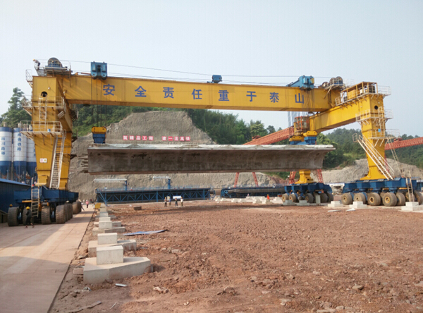 900T輪式提梁機(jī)是吊運(yùn)箱梁的主要起重設(shè)備,自重550噸,額定運(yùn)載能力900噸,凈跨寬度38米,起吊高度12.5米,主要用于24米至32米箱梁的脫模移梁施工。該提梁機(jī)的主體結(jié)構(gòu)由行走系統(tǒng)、起升系統(tǒng)、動(dòng)力系統(tǒng)、液壓系統(tǒng)、電控系統(tǒng)、制動(dòng)系統(tǒng)、操作系統(tǒng)等主要結(jié)構(gòu)組成。其外部主體結(jié)構(gòu)還包括端主梁與橫梁,主梁另有單主梁與雙梁形式;4條支腿、64個(gè)車(chē)輪。該機(jī)主結(jié)構(gòu)為門(mén)架結(jié)構(gòu),采用“人”字型支腿,可進(jìn)行大幅度起升、高度調(diào)整和90°轉(zhuǎn)向跨區(qū)作業(yè),結(jié)構(gòu)先進(jìn)、合理,操作可靠、安全,作業(yè)靈活。