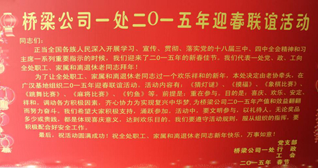 李總說:“2014年橋梁公司的發(fā)現(xiàn)形勢(shì)很好,完成產(chǎn)值23億多元,新增了高鐵、預(yù)制梁場(chǎng)、高速公路養(yǎng)護(hù)等業(yè)務(wù),繳清了公司歷年拖欠的住房公積金,企業(yè)有今天的發(fā)展離不開前輩的努力和支持,在今后的工作中,我們將繼續(xù)為職工們辦實(shí)事辦好事。希望老前輩安排好新春生活,身體健康,家庭幸福。”
