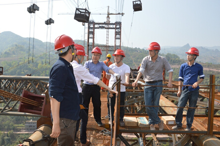 蔡樂軍董事長在磨刀溪特大橋鋼管拱合龍段與項目技術(shù)人員進行交流