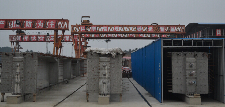 自2013年8月進(jìn)入麻武高速后,T梁預(yù)制場(chǎng)與項(xiàng)目部駐地同步規(guī)劃建設(shè)。于12月份正式投產(chǎn)生產(chǎn)梁板。為提升梁板質(zhì)量,加快生產(chǎn)形象進(jìn)度,積極響應(yīng)業(yè)主標(biāo)準(zhǔn)化施工要求,首次引進(jìn)鋼筋數(shù)控彎曲機(jī),數(shù)控張拉壓漿設(shè)備,T梁養(yǎng)生夏季噴淋養(yǎng)護(hù)、冬季蒸汽養(yǎng)護(hù)設(shè)施,保持一年四季進(jìn)行T梁生產(chǎn)作業(yè)。為追趕晚一、三標(biāo)半年建設(shè)工期提供保障。