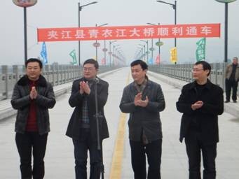 2014年12月22日,通過四川路橋橋梁公司特種工程分公司的建設者們艱苦卓絕的努力,勝利完成了夾江縣青衣江大橋加固改造工程。上午11時,青衣江大橋加固改造工程項目部在現場舉行了通車儀式。夾江縣縣委副書記盧洪,副縣長羅國雄,副局長楊華,特種工程分公司黨支部書記魏文生出席了慶祝儀式并致辭。