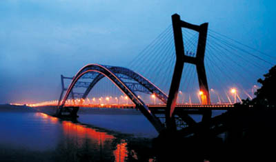 主跨400米,雙飛燕斜拉鋼管砼拱橋,2007年7月建成通車,世界首座斜拉鋼管拱橋。單側(cè)吊裝節(jié)段27段,單節(jié)段最大吊重120噸,公司承擔(dān)主拱吊裝工程。